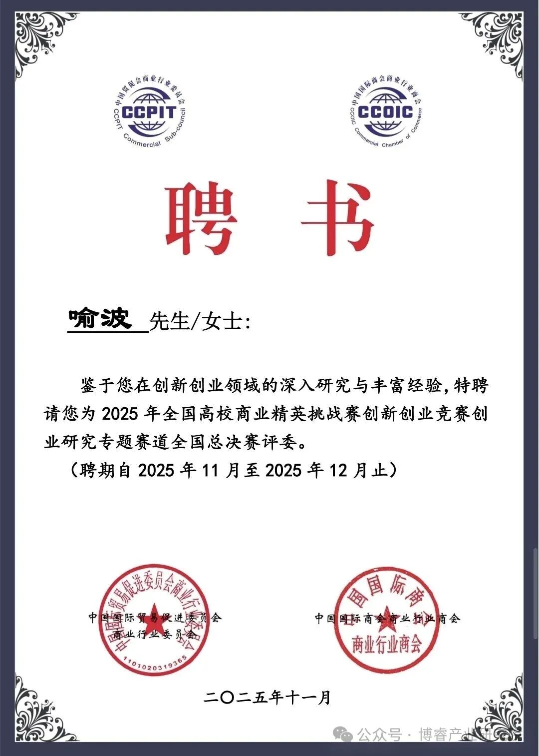 博睿产业研究院院长、深圳市智能制造产业促进会联席会长、全球人工智能电子联盟联席主席喻波,受邀担任2025年全国高校商业精英挑战赛创新创业竞赛创业研究专题赛道全国总决赛评委。