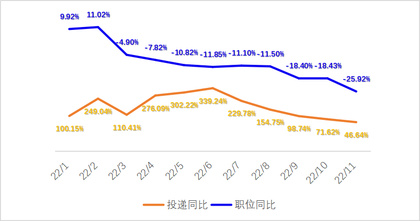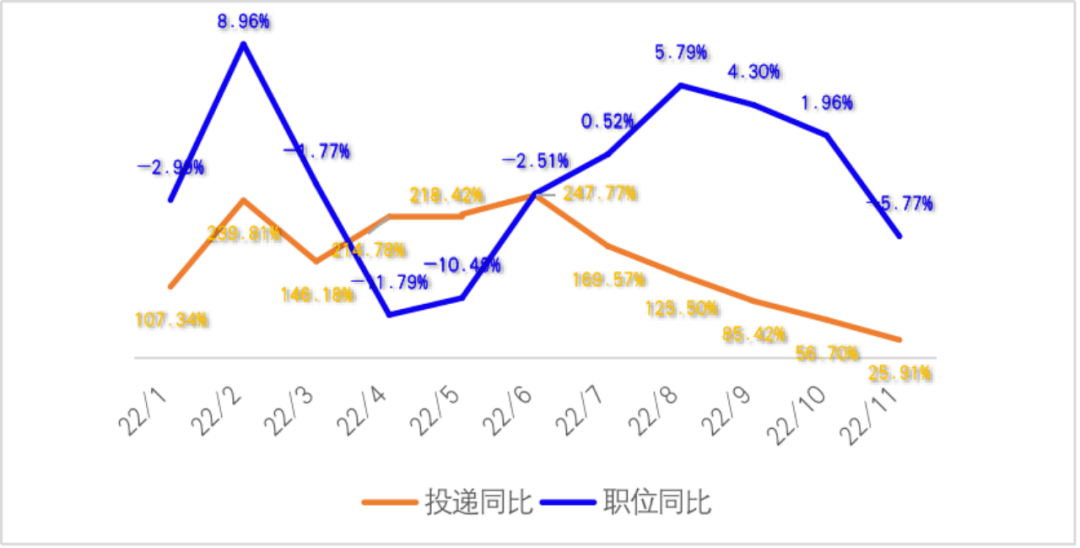 2022年,全国范围的不稳定因素增加让就业市场的环境趋向保守;从全国职位供需情况来看,整体职位数波动情况与往年相近,较为平稳;但从职位增长情况来看,在3月开启的全国大范围疫情影响之下,职位同比开始出现下降,4月份职位同比下降达11.79%;同时受大环境影响,人才供给远超往年,6月同比出现247.77%的简历投递增幅。