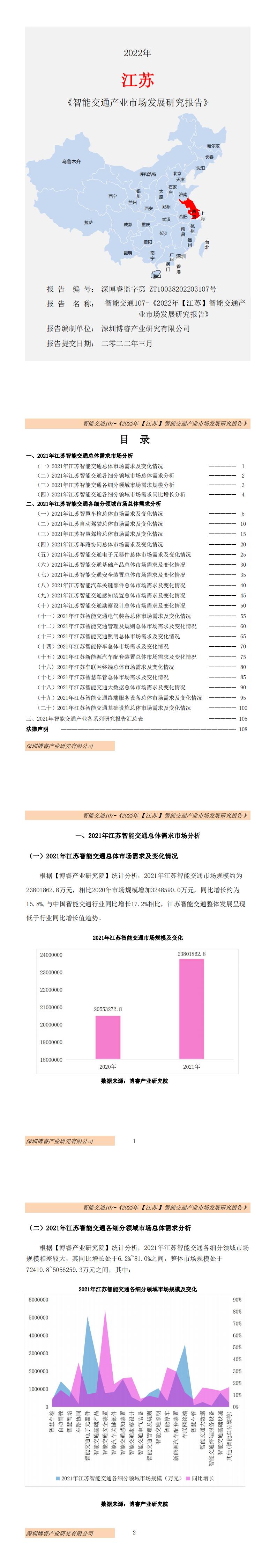 根据【博睿产业研究院】发布的智能交通107-《2022年【江苏】智能交通产业市场发展研究报告》明确指出,2021年江苏智能交通市场规模约为23801862.8万元,相比2020年市场规模增加3248590.0万元,同比增长约为15.8%,与中国智能交通行业同比增长17.2%相比,江苏智能交通整体发展呈现低于行业同比增长值趋势。